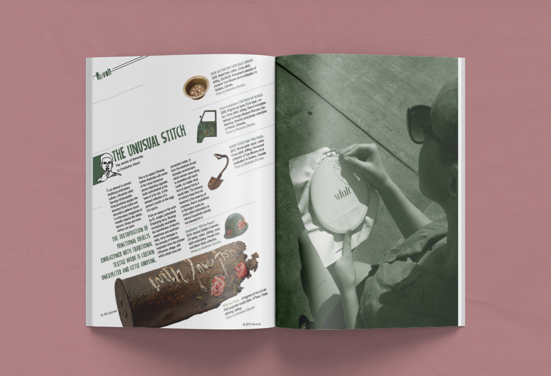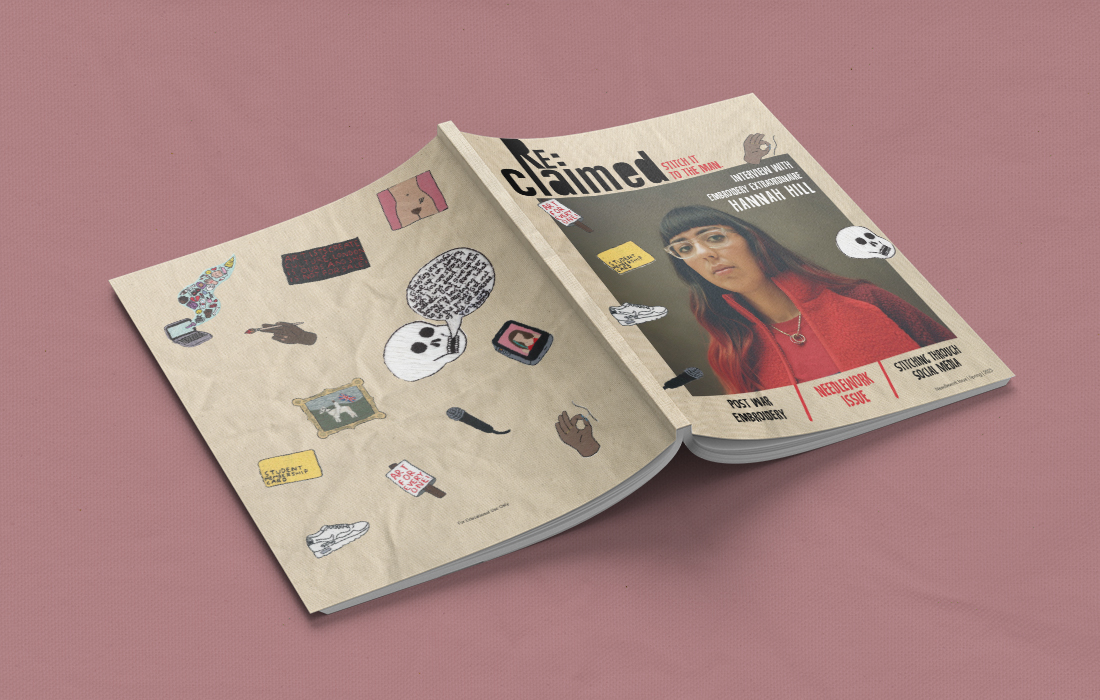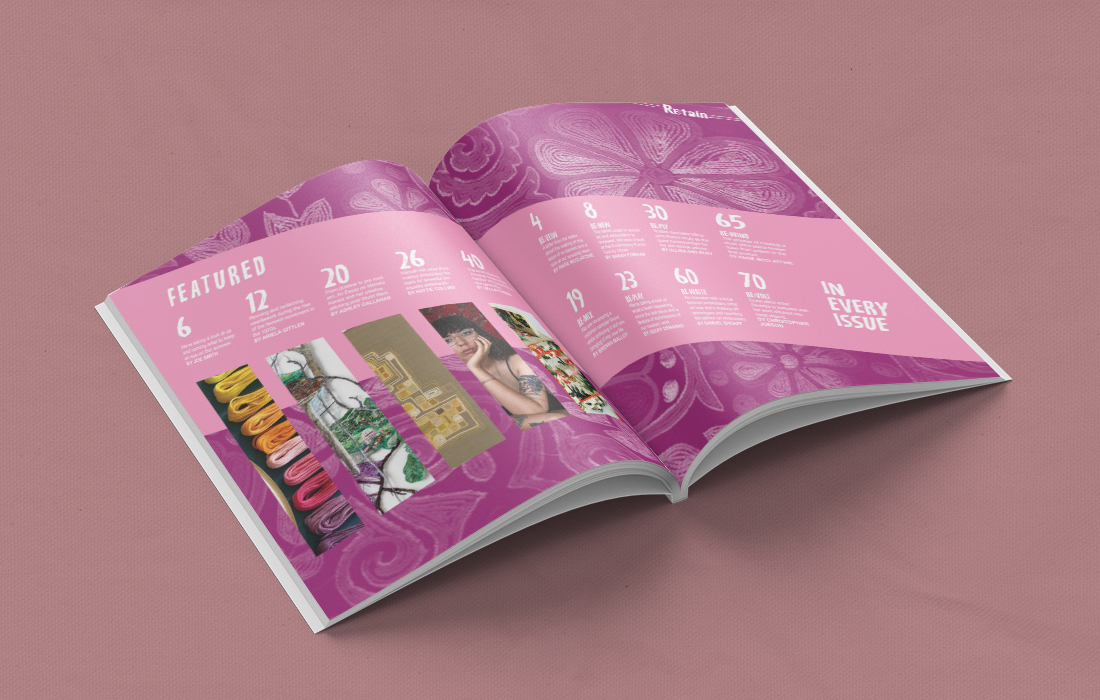 To reclaim something is to take it back to its original meaning. RE:claimed is a quarterly feminist crafting magazine that looks at the ladies making “women’s work” fine art. The alternative feel of the magazine is mimicked in the custom diagonal grid of the department pages. I created the filler photography, hand stitching of the title of the feature spread, and the stitching and the artwork featured in the infographic spread.